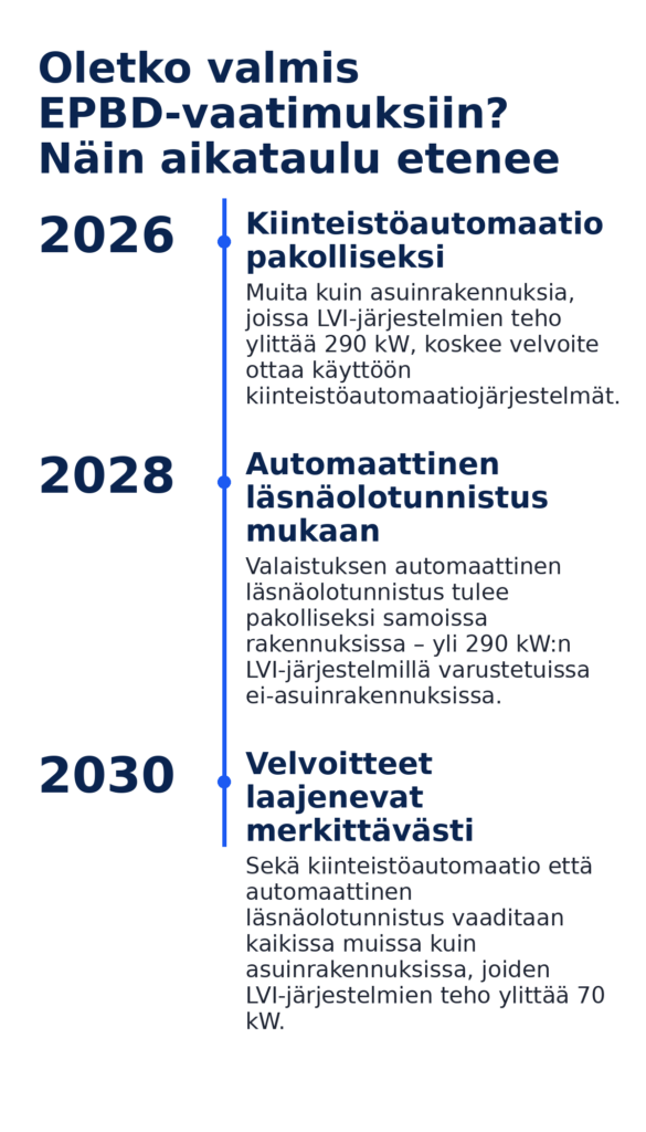 Rakennusten energiatehokkuusdirektiivi EPBD (Energy Performance of Buildings Directive) tuo seuraavien vuosien aikana merkittäviä velvoitteita kiinteistöjen automaatioon ja älykkääseen valaistukseen. Tavoitteena on parantaa rakennusten energiatehokkuutta, pienentää kustannuksia ja vähentää hiilijalanjälkeä – mutta samalla myös lisätä kiinteistöjen turvallisuutta ja käyttömukavuutta.