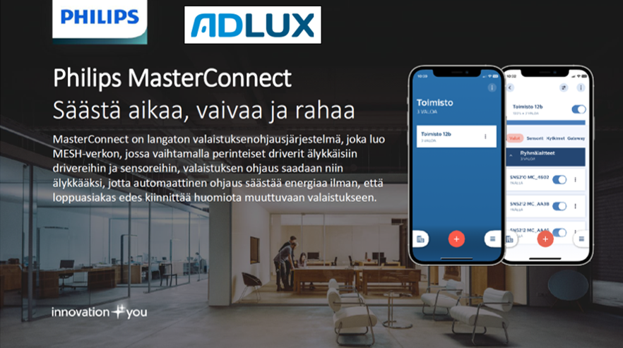 Philips MasterConnect -järjestelmän avulla voit luoda kytkettyjä valaistusratkaisuja, jotka ovat yksinkertaisia ja laajennettavia, ilman asennus- ja käyttöönotto-ongelmia.