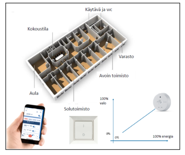 Valoteho voidaan asettaa säätymään valaisinkohtaisesti valoisuusmittauksen perusteella, jolloin luonnonvalo säästää aidosti energiaa valaistuksen kärsimättä.